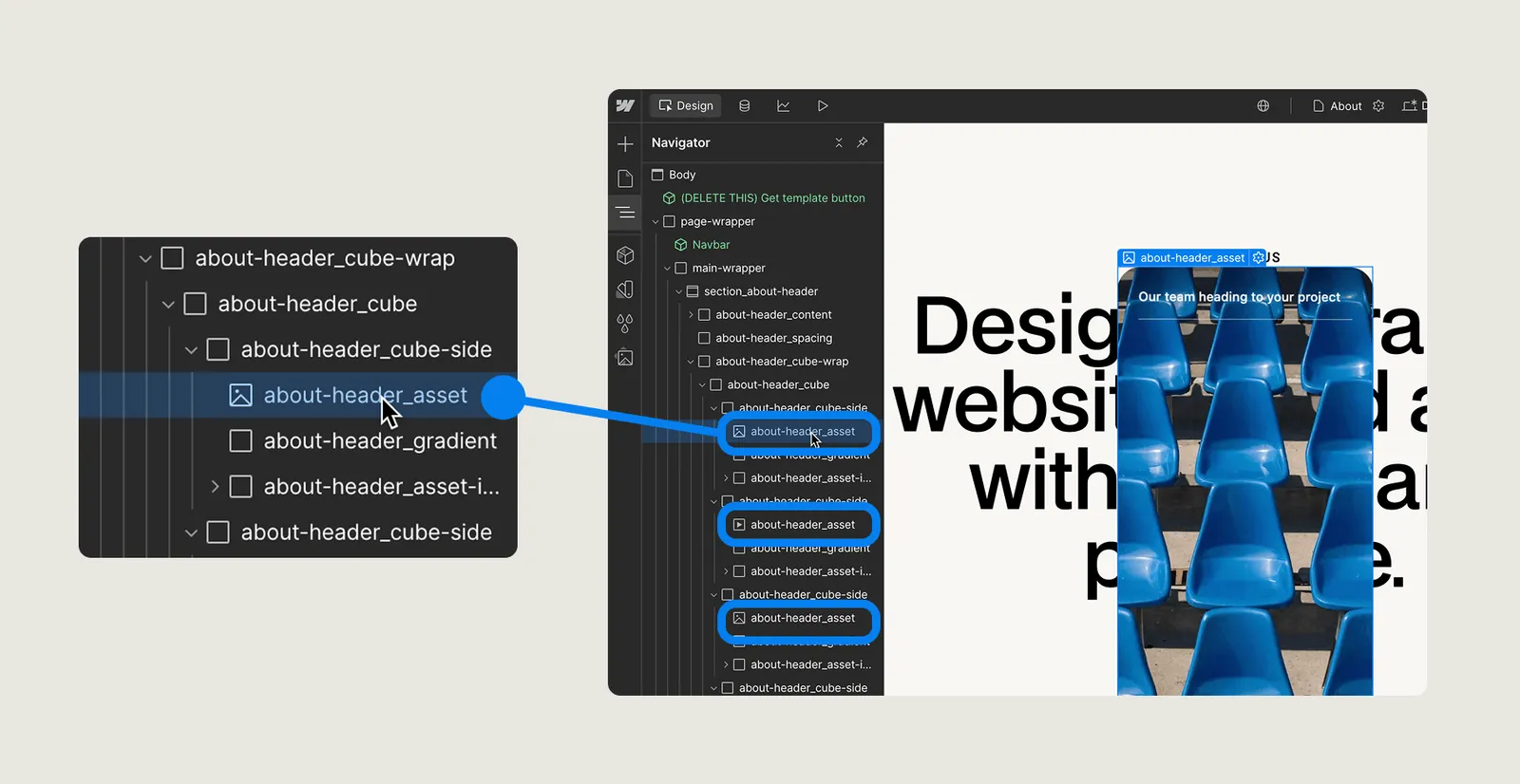 There’s an animation in the homepage header that cycles through three different headings. As you may have noticed, only the first heading is visible on the canvas. To edit the other two, you’ll need to use the Navigator panel to select them manually.